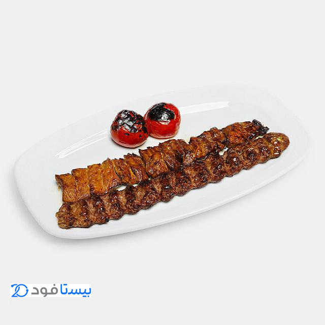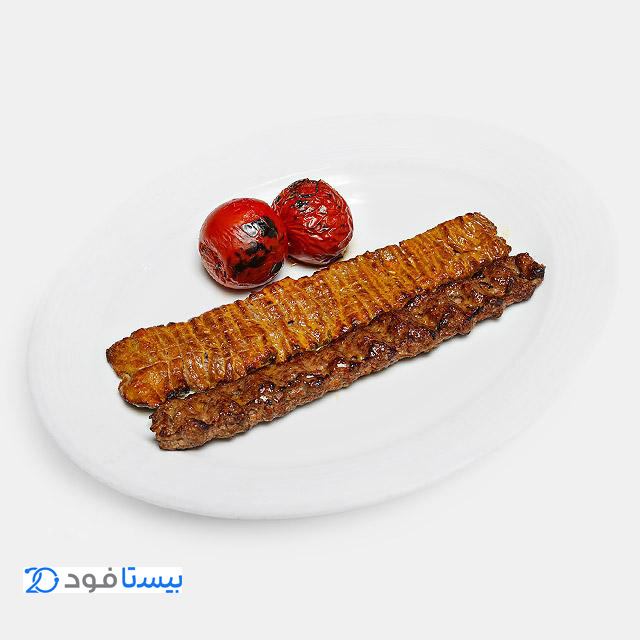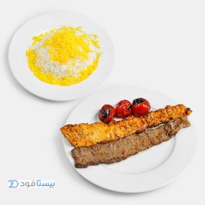 یک سیخ کباب برگ گوشت راسته گوسفندی ۱۴۰ گرمی، یک سیخ کباب کوبیده گوشت گوسفندی ۸۰ گرمی، یک پرس برنج ایرانی ۳۵۰ گرمی، بدون دورچین