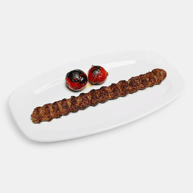 کباب کوبیده گوشت گوسفندی ۸۰ گرمی، یک پرس برنج ایرانی ۳۵۰ گرمی، بدون دورچین