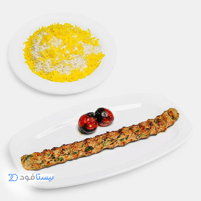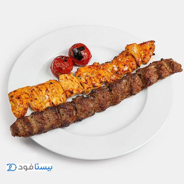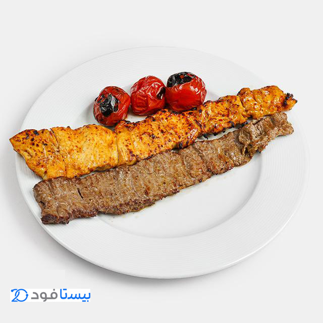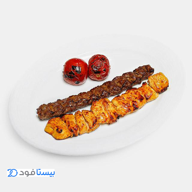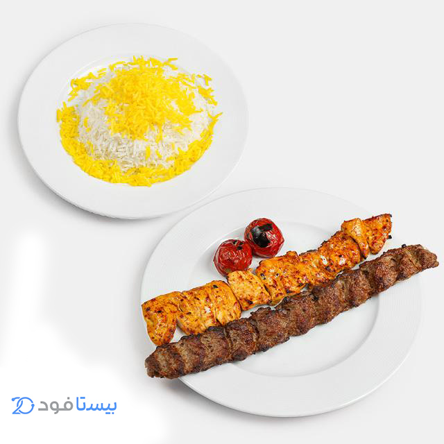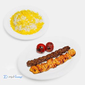 یک سیخ کباب کوبیده گوشت گوسفندی ۸۰ گرمی، یک سیخ جوجه کباب سینه مرغ ۱۸۰ گرمی، یک پرس برنج ایرانی ۳۵۰ گرمی، بدون دورچین