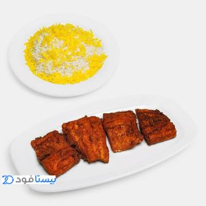 ۴۰۰ گرم ماهی قزل آلا سرخ شده، یک پرس برنج ایرانی ۳۵۰ گرمی