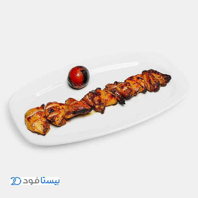 یک سیخ کباب لقمه سینه مرغ ۱۸۰ گرمی، ۲ عدد گوجه کبابی، همراه با ادویه ویژه