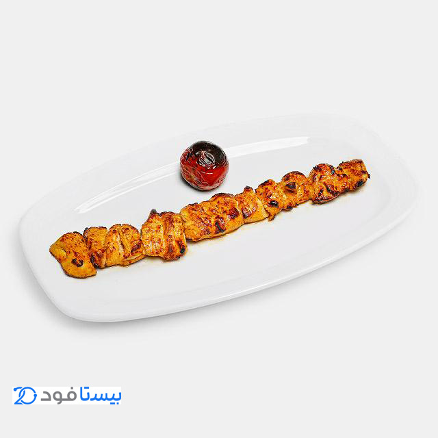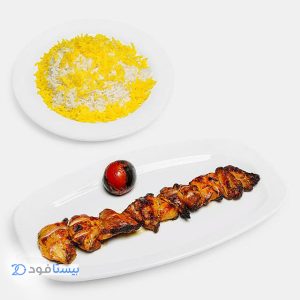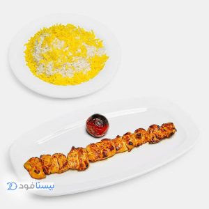 یک سیخ کباب لقمه سینه مرغ ۱۸۰ گرمی، ۳۰۰ گرم برنج ایرانی، ۲ عدد گوجه کبابی همراه با ادویه ویژه