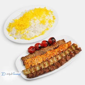 یک سیخ کباب لقمه گوشت گوسفندی ۲۱۰گرمی، یک سیخ کباب فیله گوسفندی ۲۲۰گرمی، یک سیخ جوجه کباب فیله مرغ ۴۰۰ گرمی،۴پرس برنج ایرانی ۳۵۰ گرمی با دورچین