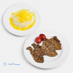 یک سیخ کباب برگ گوشت راسته گوسفندی یک سیخ 250 گرمی، یک پرس برنج ایرانی ۳۵۰ گرمی، بدون دورچین